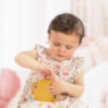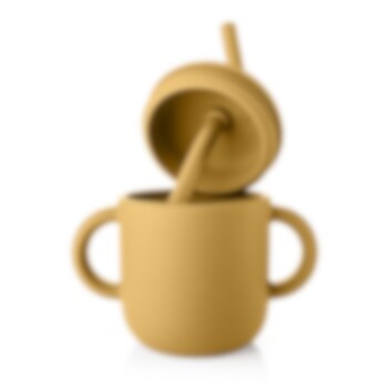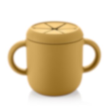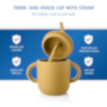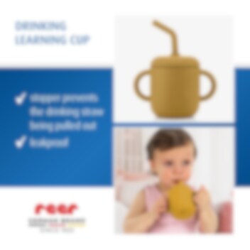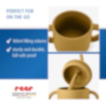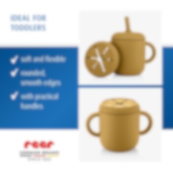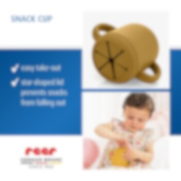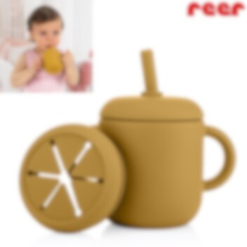 Reer 2-in1 Drinking and SnackCup Yellow är en smart och användar barnmugg som även kan användas som snacksburk. Produkten innehåller en greppvänlig mugg med dubbla handtag gjord i mjuk silikon. Till muggen hör två olika lock, ett med sugrör och ett med öppnings för snacks. Snackslocket har "stjärnöppning" vilket gör det lätt för barnet att komma åt innehållet, samtidigt som det inte trillar ut om barnet tappar muggen. Sugröret går hela vägen ner till botten, så att all vätska nås. Muggen är tillverkad i livsmedelsgodkänd och giftfri silikon och rymmer 180 ml.