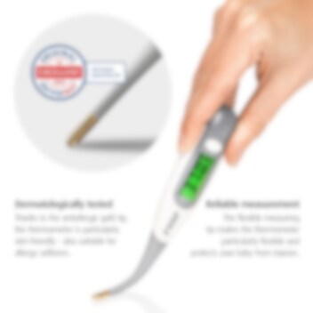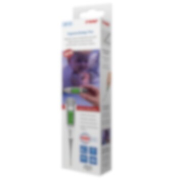 Reer ExpressTemp Pro är en snabbmätande digital febertermometer som fungerar lika bra för barn som för vuxna. Febertermometern har en dermatologiskt testad topp, som både är skonsam mot babyns känsliga hud och som är allergisäker. Dessutom så är toppen böjbar. Febertermometern mäter temperaturen på ca 10 sekunder och visas på en tydlig LCD-display. När termometern startas, visas resultatet av föregående febermätning. Reer ExpressTemp Pro är vattentät och levereras i ett praktiskt förvaringsskydd.