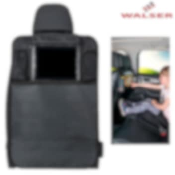 Praktiskt och skyddande sätesskydd till bil med iPad hållare (upp till 10 tums skärm) och två nätfickor (tex för dryckesflaska eller snacks). Walser Premimum Kenny är gjort i vattenavstötande och tåligt 600 D polyester som skyddar framsätets baksida mot smuts, repor och slitage. Surfplattan och dess reglage kan nås både uppifrån och från sidorna.