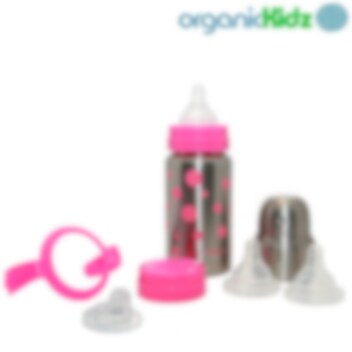 Smart set från OrganicKidz innehållande praktisk termosnappflaska (200 ml) i rostfritt stål och många tillbehör. Nappflaskan håller drycken varm eller kall upp till 6 timmar. OrganizKidz nappflaska är ett funktionellt och säkert alternativ till plast- och aluminiumflaskor. Fri från PVC, bisfenol A och Ftalater. Smart och praktisk på resan, på stan eller i naturen.