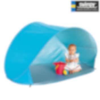 Swimpy Ljusblå strandtält är ett rymligt och stadigt UV tält för soliga dagar på stranden. UV-tältet är enkelt att fälla upp och ta ned med pop-up teknik. När strandtältet inte används så packas det i den medföljande transportväskad. UV-tältet kan fästas i fästöglor på tältet sida med tältpinnar (köps separat) för blåsiga dagar. Strandtältet har UV-skydd SPF 50+ och ger skön skugga på stranden.