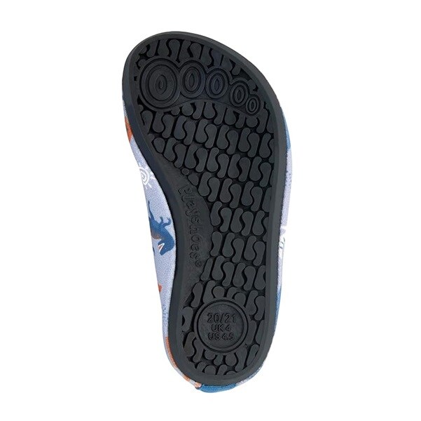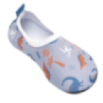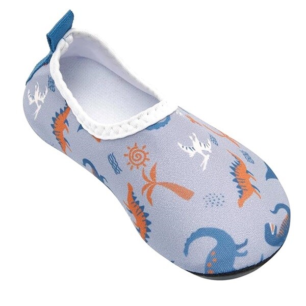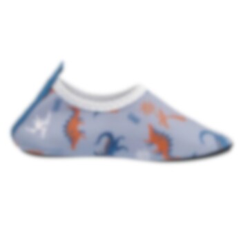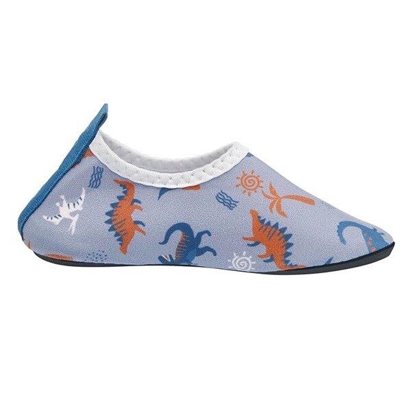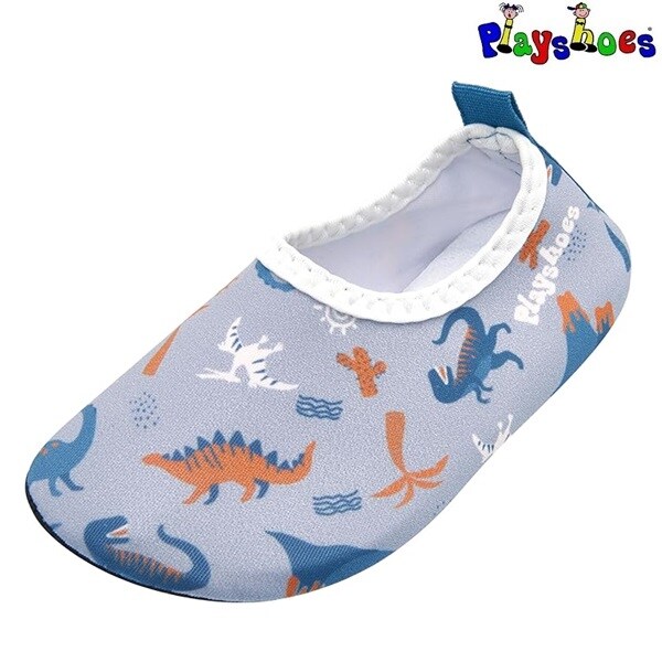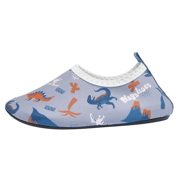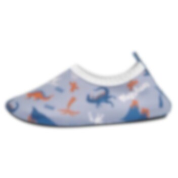 Playshoes Uni Dinos Allover är ett par sköna, lätta och skyddande UV badskor för barn med solskydd SPF 50+. Badskorna är gjorda i bekvämt och snabbtorkande material och hålls fast på foten med elastiskt resår runt foten. Skorna har en rejäl gummisula i TRP som skyddar barnets fot mot skarpa stenar och från het sand på stranden.