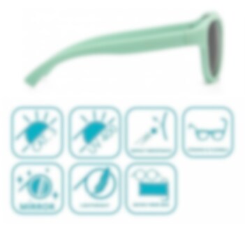 Koolsun Air Grayed Jade är tåliga, snygga och skyddande solglasögon för barn i modern design och med bra passform. Koolsun solglasögon Air Grayed Jade har pilotform och har tålig ram och skalmar i flexiblet material (TPE). Spegelglasen i Revo-teknik, som inte kan gå sönder, är gjorda i stark polycarbonat som ger 100 % UV-skydd mot både UV-A och UV-B och har högt motstånd mot repor. Alla Koolsun glasögon levereras med en förvaringspåse gjord i microfiber.