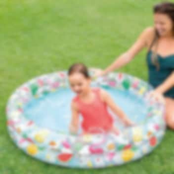 Härlig uppblåsbar barnbassäng för bus och bad under varma och soliga dagar i trädgården eller på semesterresan. Intex barnpool Fruit är CE-märkt och har tre separata luftkammare med säkerhetsventiler och är 122 cm i diameter.