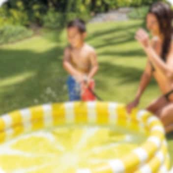 Intex Lemon är en stabil och uppblåsbar barnbassäng med plats för plask och vattenbus. Barnpoolen är 147 cm i diameter och har två separata luftkamrar med säkerhetsventiler, är säkerhetstestad och gjord i hållbar vinyl.