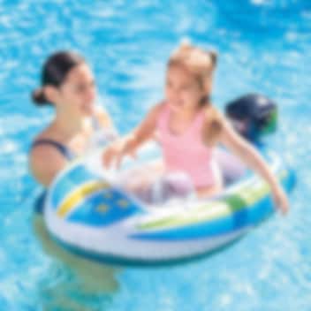 Uppblåsbar badbåt (Pool Cruiser) för soliga och glada dagar i poolen. Badbåten är 114 x 76 cm och har säkerhetsventiler. Båten är tänkt för barn mellan 3-6 år och har en kapacitet upp till 27 kg.