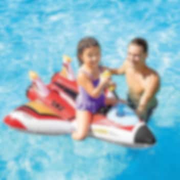 Intex Water Gun Plane Ride on Red är ett uppblåsbart flygplan gjort i tuff och stabil design. Flygplanet är väl tilltaget i storlek (117 x 117 cm) och utrustat med en vattenpistol. Invid hållaren till vattenpistolen finns ett handtag att hålla fast i. Flygplanet är gjort i kraftig vinyl som är motståndskraftig både mot sol och saltvatten. Tänkt för barn från ca 3 år.