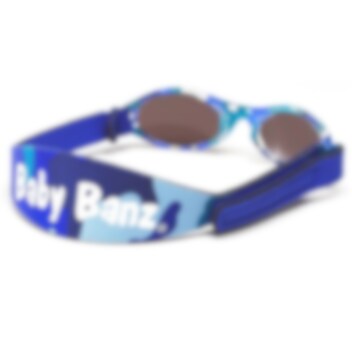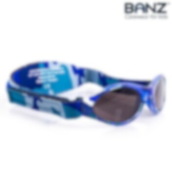 Banz solglasögon KidzBanz Blue Camo är bekväma och skyddande solglasögon för barn mellan 2 och 5 år. Solglasögonen är gjorda i slitstarkt och tåligt material och har 100 % certifierat UV-skydd mot både UV-A och UV-B strålning. Med mjukt och reglerbart nackband så sitter KidzBanz solglasögon stadigt på barnets huvud.