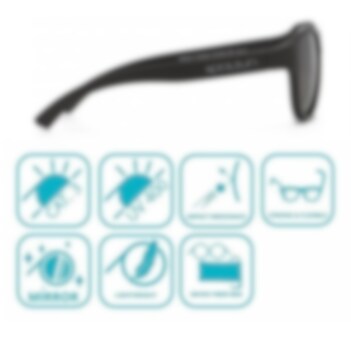 Koolsun Air Phantom Black är tåliga, snygga och skyddande solglasögon för barn i modern design och med bra passform. Koolsun solglasögon Air Phantom Black har pilotform och har tålig ram och skalmar i flexiblet material (TPE). Spegelglasen i Revo-teknik, som inte kan gå sönder, är gjorda i stark polycarbonat som ger 100 % UV-skydd mot både UV-A och UV-B och har högt motstånd mot repor. Alla Koolsun glasögon levereras med en förvaringspåse gjord i microfiber.