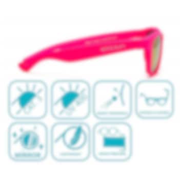 Tuffa och skyddande solglasögon för barn i snygg design och med bra passform. Koolsun Wave Neon Pink har tålig ram och skalmar i flexibelt material. Spegelglasen i Revo-teknik, är gjorda i starkt och hållbart polycarbonat som ger 100 % UV-skydd (UV-A och UV-B) och högt motstånd mot repor. Alla Koolsun glasögon levereras med en förvaringspåse gjord i microfiber.
