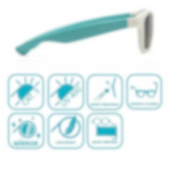 Tuffa och skyddande solglasögon för barn i snygg design och med bra passform. Koolsun Wave Whie Aquarius har tålig ram och skalmar i flexibelt material. Spegelglasen i Revo-teknik, är gjorda i starkt och hållbart polycarbonat som ger 100 % UV-skydd (UV-A och UV-B) och högt motstånd mot repor. Alla Koolsun glasögon levereras med en förvaringspåse gjord i microfiber.