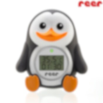 Reer My Happy Pingu är är en funktionell och praktisk digital badtermometer för bad av baby och barn. Förutom att mäta temperaturen på badvattnet, så har den en inbyggd timer. Om temperaturen blir för hög eller låg så blinkar displayen (grönt för låg temperatur och rött för hög temperatur). Vid hög temperatur eller när tiden på timern går ut, så låter en ljudsignal som varnar för detta. Varningsljud och blinkande ljus kan ställas in från 37 grader (vid leverans så är 39 grader inställt). Temperatur och timer visas i en tydlig LCD-display och badtermometern mäter mellan 0 och 50 grader (celsius). Termometern fungerar både vid bad inomhus och utomhus och även för att mäta rumstemperatur.