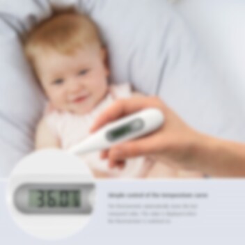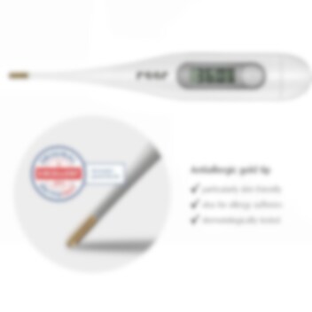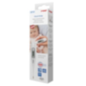 Reer Classic Temp är en digital febertermometer som fungerar lika bra för barn som för vuxna. Febertermometern har en dermatologiskt testad topp, som både är skonsam mot babyns känsliga hud och som är allergisäker. Febertermometern mäter temperaturen på ca 20 sekunder och visas på en tydlig LCD-display. När termometern startas, visas resultatet av föregående febermätning. Reer Classic Temp är vattentät och levereras i ett praktiskt förvaringsskydd.