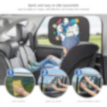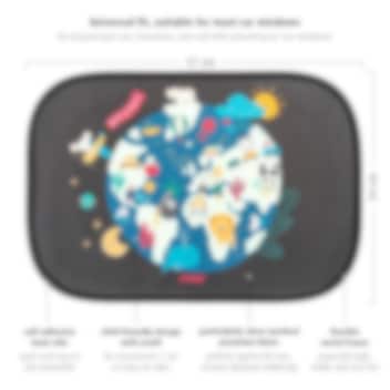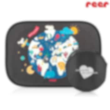 Ihopfällbart och praktiskt solskydd (2 st) till bilens sidofönster. Reer TravelKid World är självfästande (utan sugproppar) och gjort i sk "pop-up-teknik" vilket gör det enkelt att sätta upp och ta ned solskyddet. Solskyddet är rejält i storlek (51 x 34 cm) och skyddar mot solens strålar med bibehållen uppsikt för föraren. Solskyddet är universalt och passar de flesta bilmodeller.