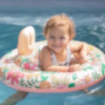 Swim Essentials Baby Float Blossom är en stabil och funktionell badring och badstol till baby. Babybadringen är 69 cm i diameter och är tänkt för barn upp till 11 kg (0-1 år). För högsta säkerhet så har Swim Essentials badstol fyra separata luftkamrar med säkerhetsventiler och är säkerhetstestad enligt EUs normer (se standard nedan). Badstolen har två stycken hål i bottnen, så att barnets ben kan hänga fritt.