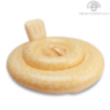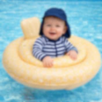 Swim Essentials Baby Float Yellow Flowers är en stabil och funktionell badring och badstol till baby. Babybadringen är 69 cm i diameter och är tänkt för barn upp till 11 kg (0-1 år). För högsta säkerhet så har Swim Essentials baby badring fyra separata luftkamrar med säkerhetsventiler och är säkerhetstestad enligt EUs normer (se standard nedan). Badstolen har två hål i bottnen, så att barnets ben kan hänga fritt.