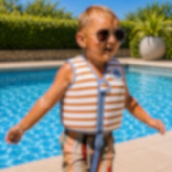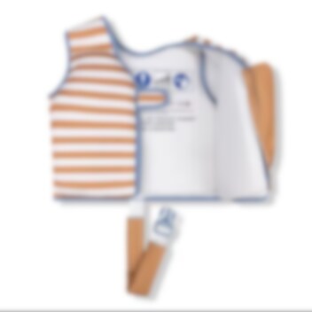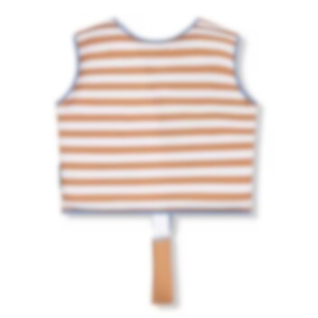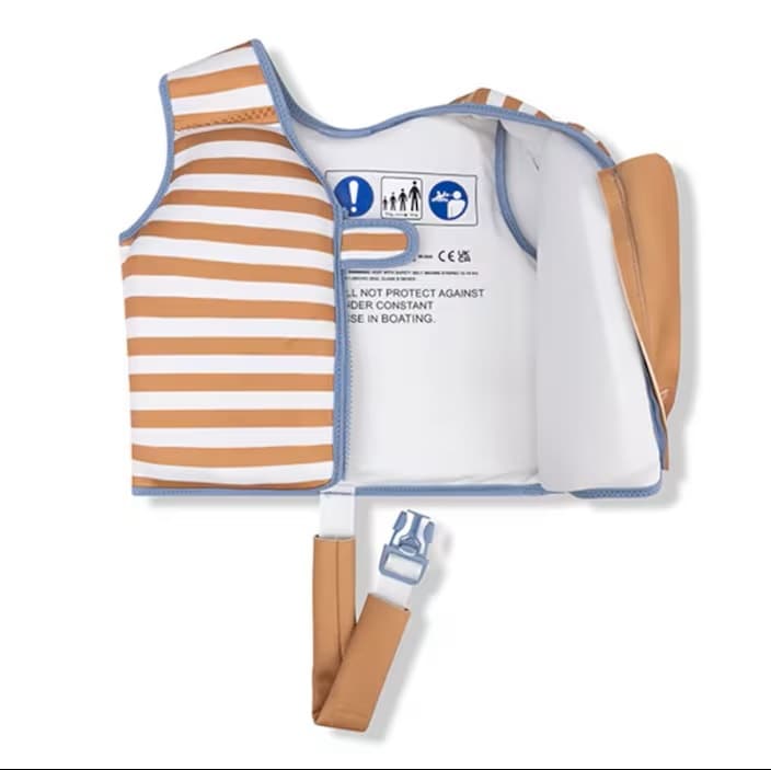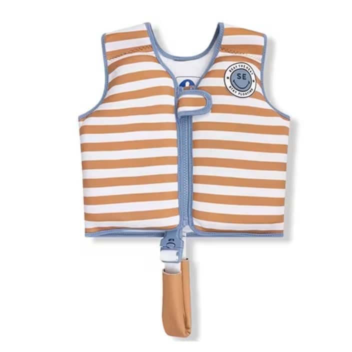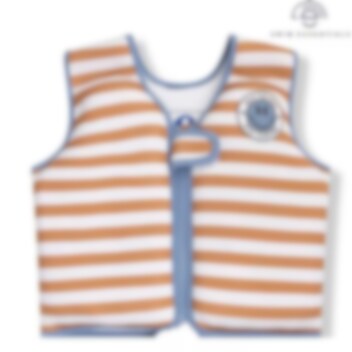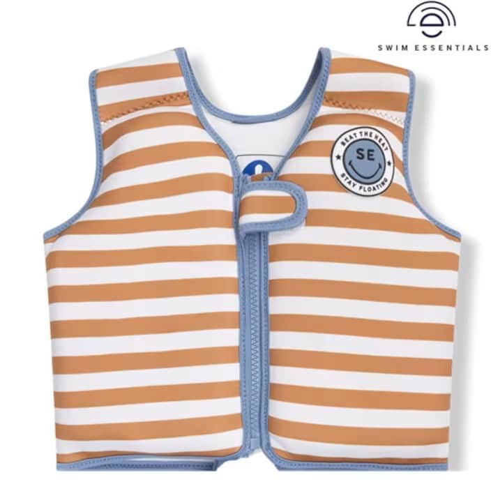 Swim Essentials Brown Striped simväst för barn är ett bra flythjälpmedel för både lek och simlärning för barn mellan 3-6 år (18-30 kg). Simvästen är gjord i mjuk och bekväm neopren med väl bibehållen rörelse för barnet i vattnet. Inuti bröstpanelerna finns skum som gör att västen flyter och ger barnet en bra position i vattnet. Simvästen stängs med blixtlås och kardborrespänne och har grenband så att västen hålls på plats.