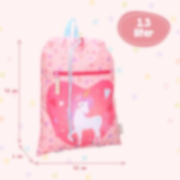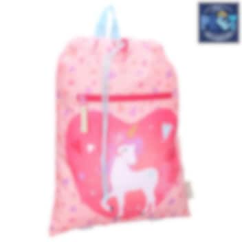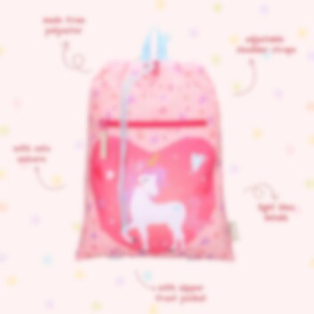Prêt Happy Go Lucky Unicorn är en söt och välgjord gymnastikpåse gjord fin enhörningsdesign. Gympapåsen är 42 x 32 cm och är perfekt att använda till gympan, träningen eller som stransdväska med plats för träningskläder, badkläder, shampoo och handduk. Gympapåsen stängs med snöre och dragsko. På baksidan finns breda bärremmar som kan ställas in i längd. På framsidan finns en liten ficka som stängs med blixtlås. Perfekt för tex mobilen eller nycklar.