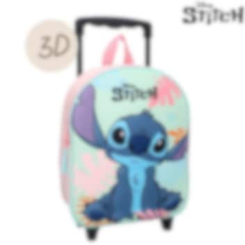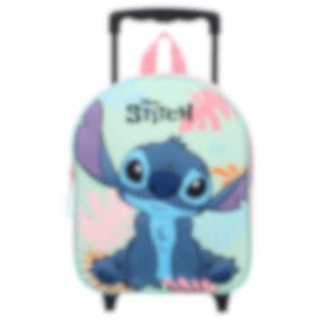 En liten resväska för yngre barn med gulligt Stitch motiv i 3D (bilden sticker ut ur framsidan på väskan). Resväskan har teleskophandtag, bärhandtag upptill, två hjul samt stödben framtill så att väskan kan ställas vertikalt. Gömda på resväskans baksida finns även vadderade och ställbara remmar så att väskan kan bäras som ryggsäck. I resväskans huvudfack ryms leksaker, pyssel, nalle, snacks och andra saker som ska med på resan. Barnresväskan Stitch Sweet but Spacey passar bra både som handbagage på flyget och som en liten prylväska att ta med på besök hos släkt och vänner.